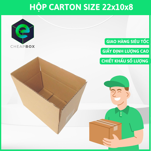 Hộp carton kích thước Dài x Rộng x Cao lần lượt là 22x10x8 dùng để đựng các sản phẩm có kích thước phù hợp, vừa vặn dựa trên kích thước gọn nhất có thể của thành phẩm mà bạn muốn đóng gói...